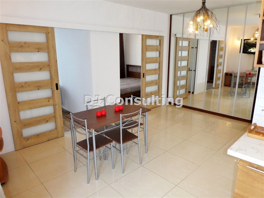Apartament wyposażony i urządzony dobrej klasy sprzętami AGD z szeroką zabudową (kuchnia, salon, przedpokój, sypialnia małżeńska), z możliwością zmiany aranżacji: wstawienia lub usunięcia niektórych mebli. Rozkład i wyposażenie: