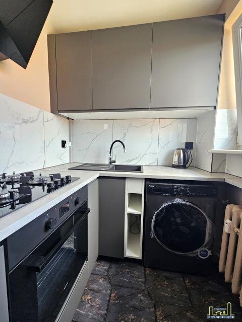 Kuchnia w pełni umeblowana i wyposażona w zabudowę wraz z lodówko-zamrażarką, piekarnikiem oraz płytą gazową.