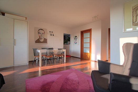 Składa się z jasnego salonu z wyjściem na balkon, dwóch sypialni, kuchni, przestronnej dużej jadalni, mogącej pełnić funkcję gabinetu, widnej w pełni wyposażonej kuchni, łazienki, osobnej toalety oraz przedpokoju.