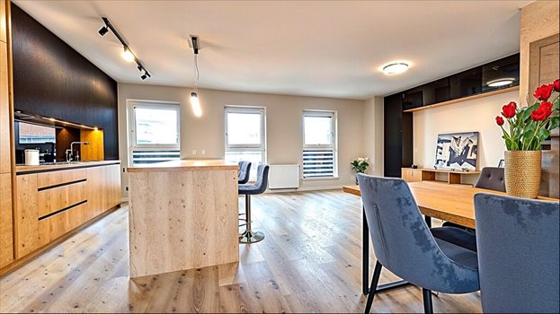 - Przestronnego salonu z aneksem kuchennym, strefą jadalni i wypoczynku. Salon wyposażony we wszystkie sprzęty AGD, ma wyjście na balkon, klimatyzację;