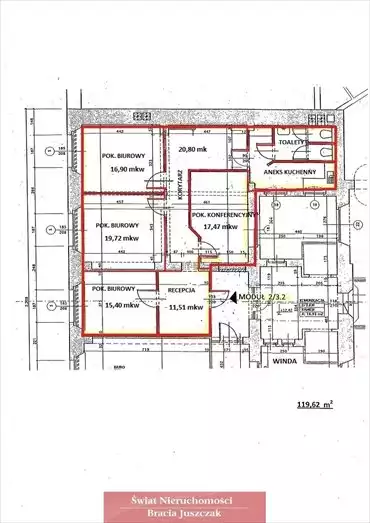 Prezentujemy Państwu przestrzenny, funkcjonalny i niezależny moduł biurowy o pow. 120 mkw składający się z: - recepcja 11,...