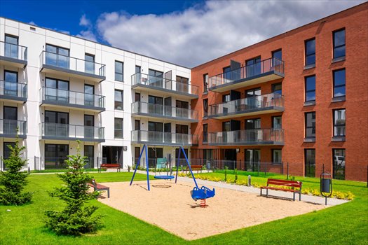 Biała elewacja idealnie komponuje się z okładziną ceglaną i otaczającą osiedle zielenią. Efektownie prezentują się również balkony z balustradami wypełnionymi szkłem.