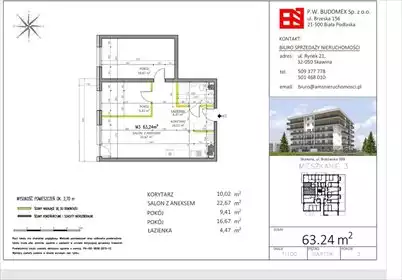 Mieszkanie o powierzchni 58,93 m2 położone z II piętrze pięciopiętrowego budynku. Składa się z pokoju dziennego z aneksem kuchen...