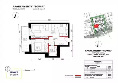 APARTAMENTY SOWIA Nowa inwestycja na terenie Marek!! 14 lokali mieszkalnych. Od 2 do 3 pokoi. Od 42 m2 do 63 m2. Kupujący ...
