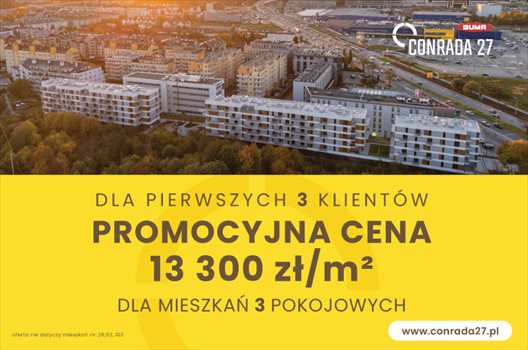 Conrada 27 z pewnością będzie się wyróżniać ciekawą elewacją, z charakterystycznymi dwukolorowymi pasami. Od głównej ulicy osiedle oddzielone będzie zieleńcem izolującym od tętniącej życiem części miasta. Inwestycja podzielona jest na dwa budynki, z których jeden składa się z dwóch brył połączonych garażem umieszczonym na parterze.\